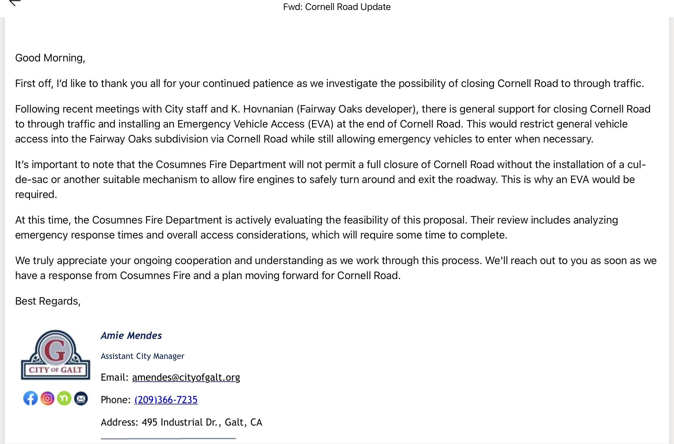 WHAT YOU CAN DO NOW. Attend the Tuesday, July 15, 2025, Galt City Council meeting at 6:00 PM. The Fairway Oaks Final Map item will be on the consent calendar that is typically heard at the beginning of the meeting. We want to be certain they don’t try to make any late changes to the Final Map to try to close Cornell Road. (It would be very unusual to do so) Also, we want to make a clear point that we are watching and we are concerned. The City Council will have received our letter and signatures by the meeting and will know we DO NOT WANT CORNELL CLOSED which will send traffic to Ranch Road!
